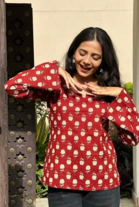 Women’s Red Cotton Printed Full-Sleeve Top
