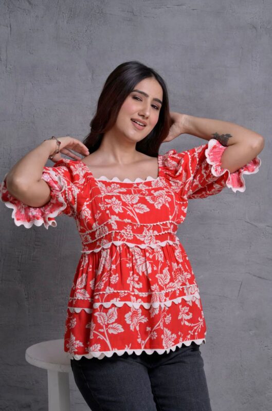Women’s Red Floral Printed Puff Sleeve Top