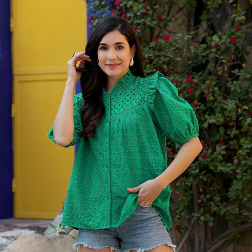 Women’s Green Embroidered Puff Sleeve Top