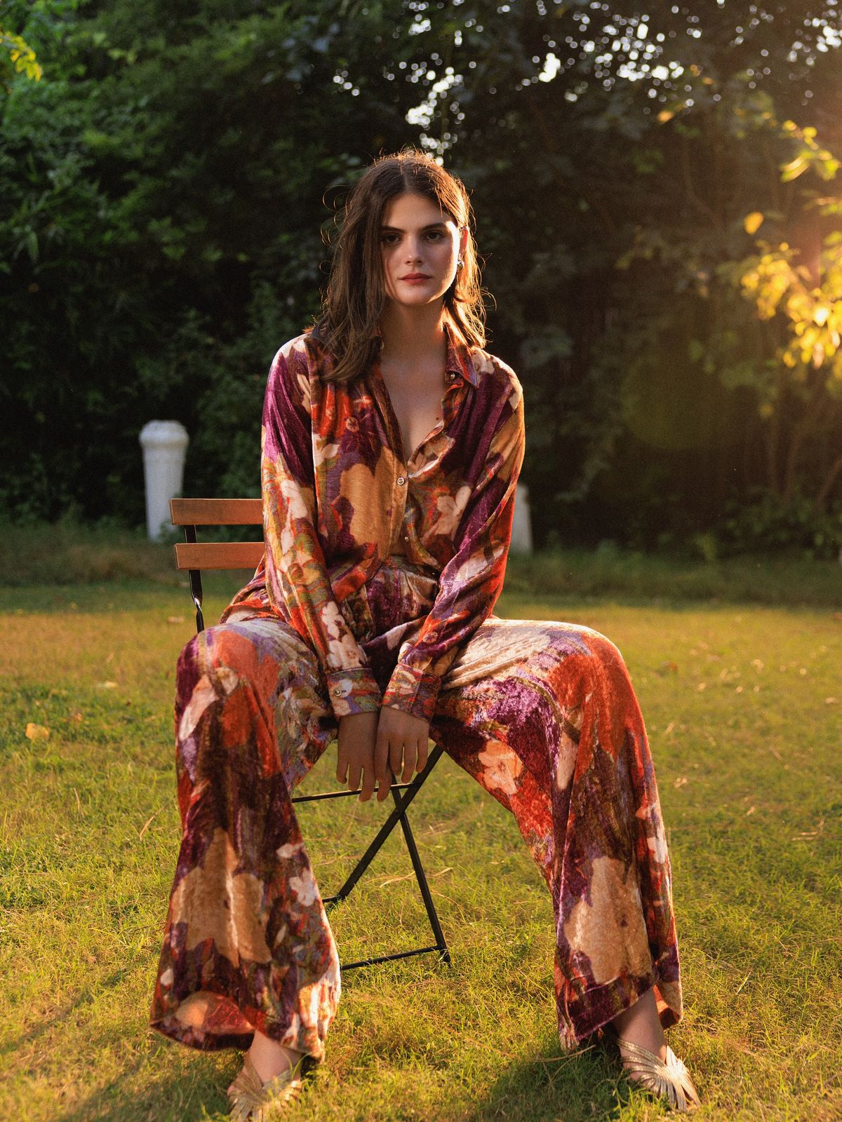A luxurious velvet floral co-ord set with a button-down shirt and wide-leg pants, designed for refined comfort, rich texture, and statement day-to-evening wear.
