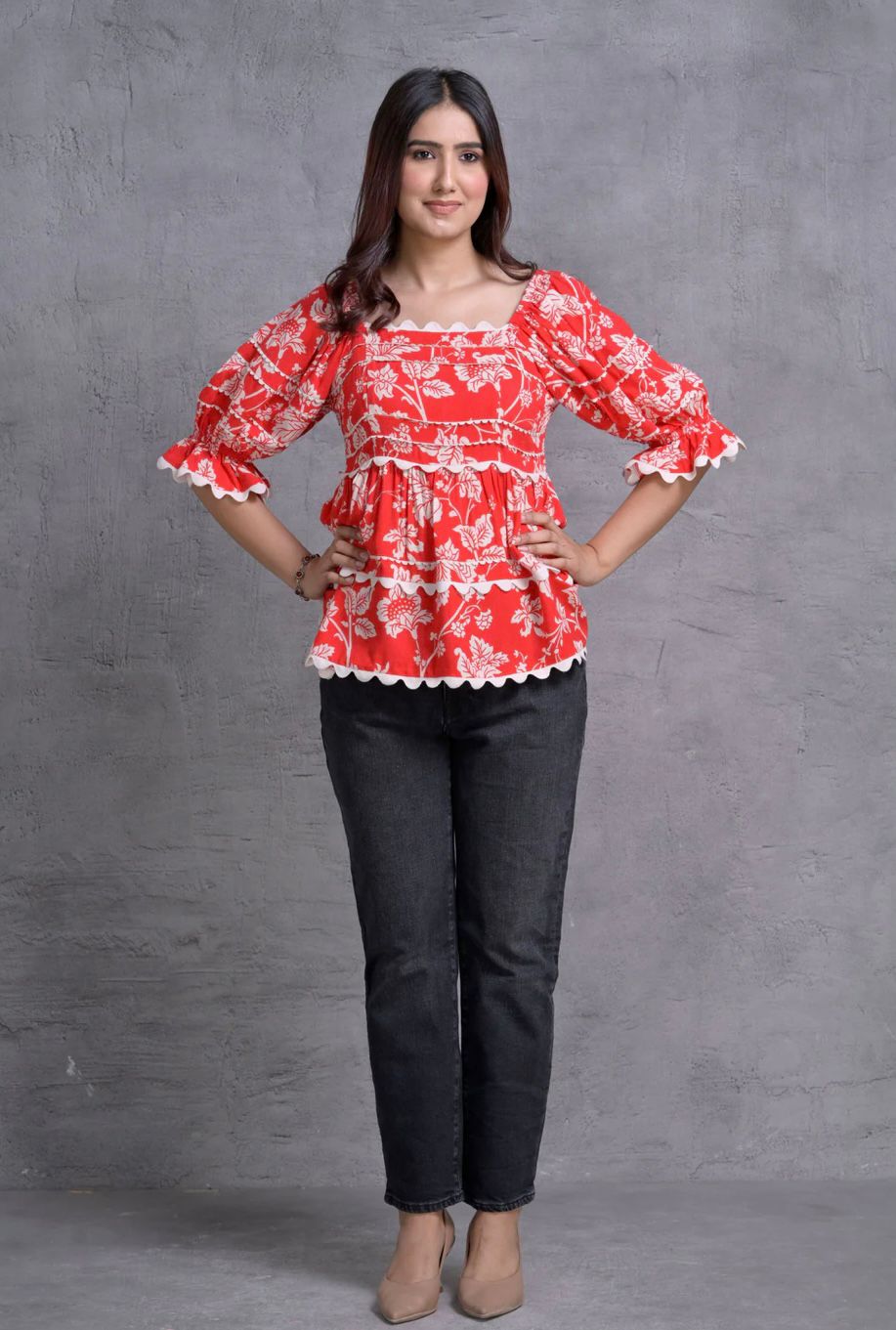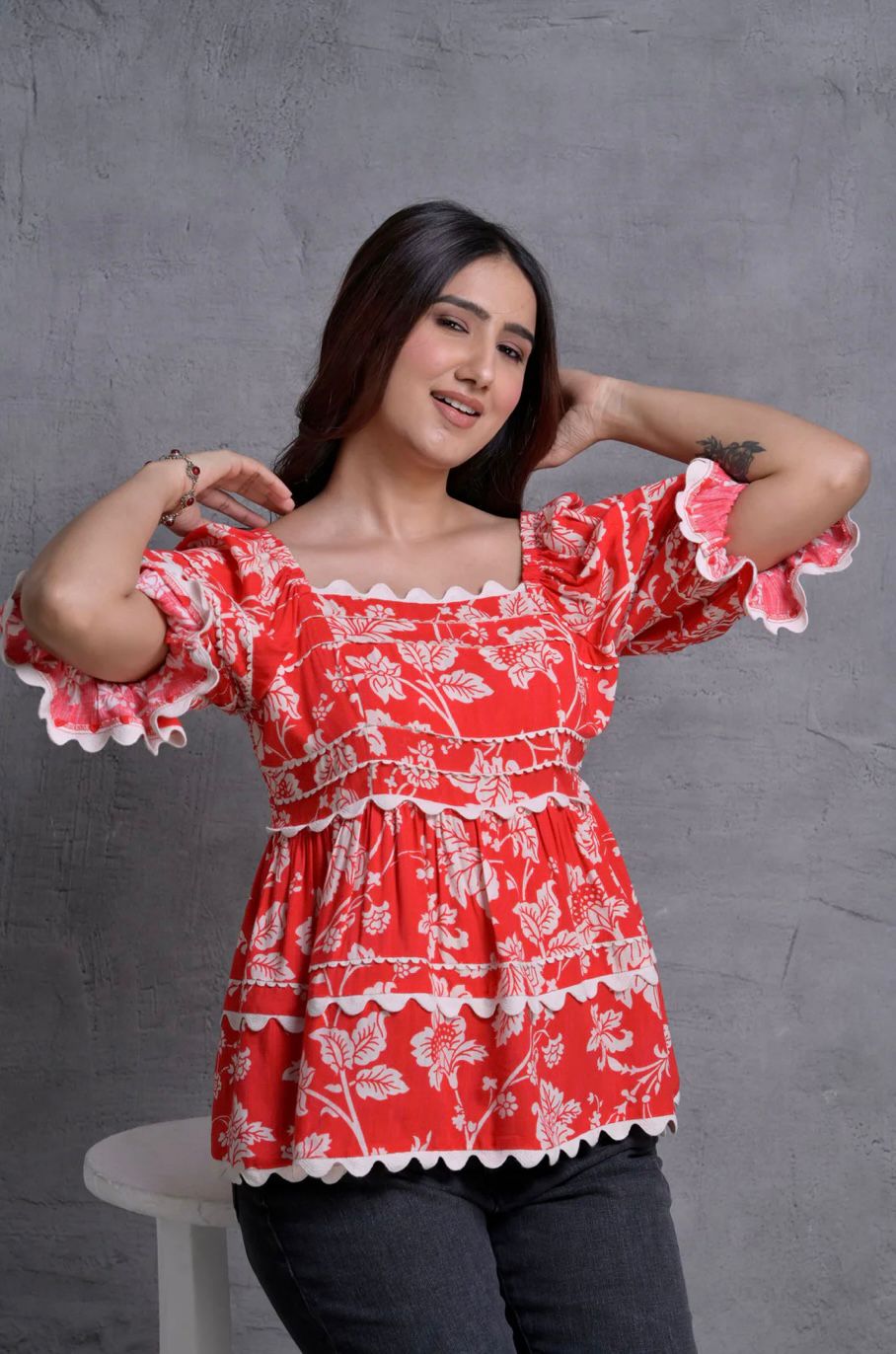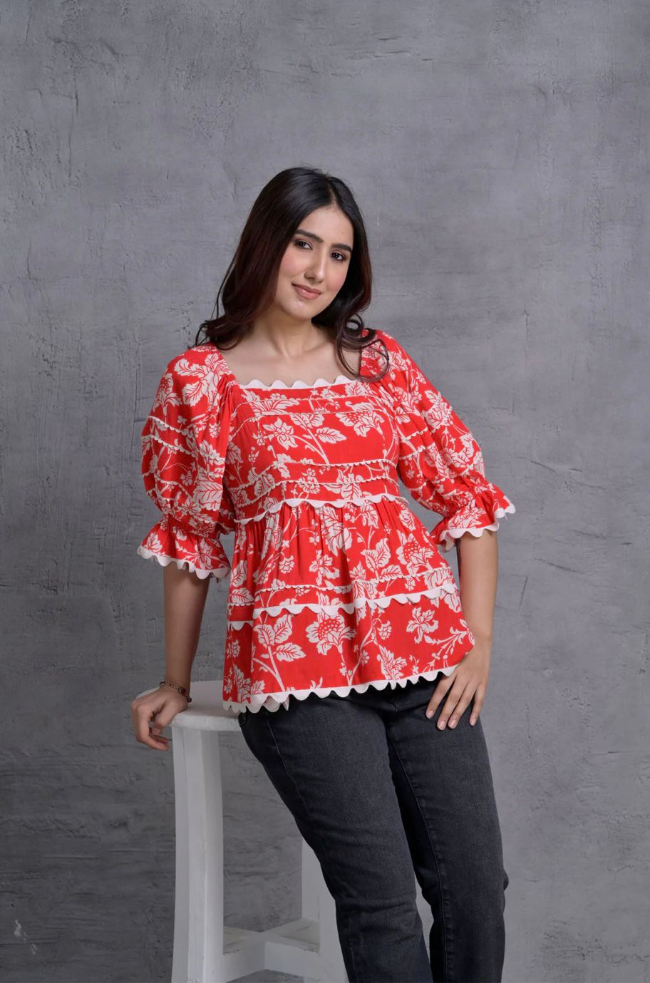 Add a pop of color to your wardrobe with this stylish red floral printed top. Designed with puff sleeves and a flattering fit, it’s perfect for casual outings and everyday wear.